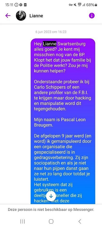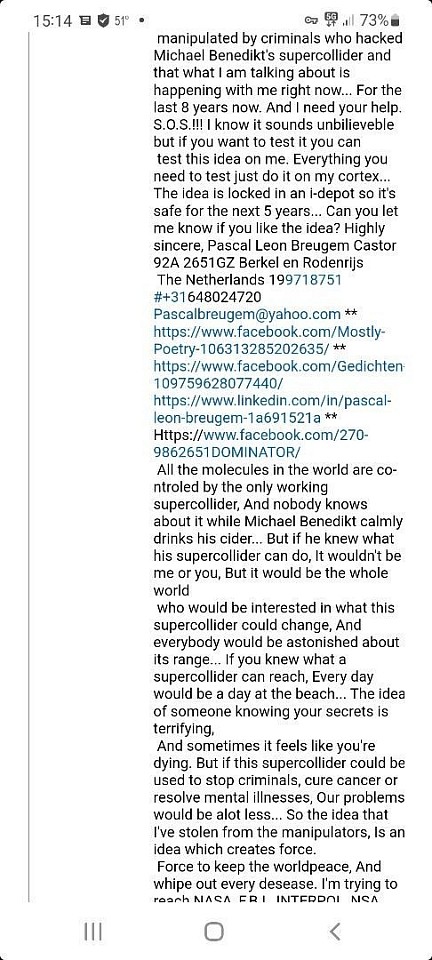 Sinds ongeveer tien jaar word ik gemanipuleerd door een criminele organisatie die gespecialiseerd is in gedragsverandering. Het systeem dat zij hiervoor gebruiken is een gehackte deeltjesversneller. Zij kunnen hiermee moleculen controleren en onder stroom zetten. En communiceren met de geest van een mens. Ik weet dat dit ongelofelijk klinkt. Maar als hier een expert op word gezet zal ik gelijk krijgen. Ik ben alleen al lange tijd op zoek naar zo'n expert... Kunt u mij helpen de juiste persoon te vinden?
